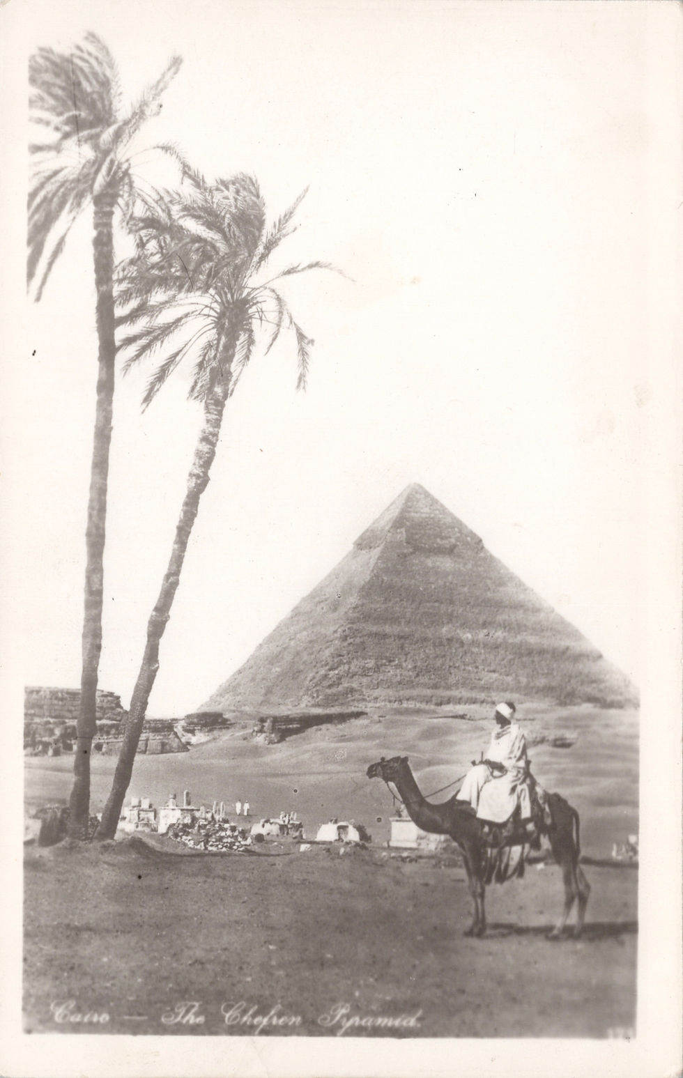 Title: PC02 PC02155 – Pyramid of Chefren with Camel Riders, Posted 1934